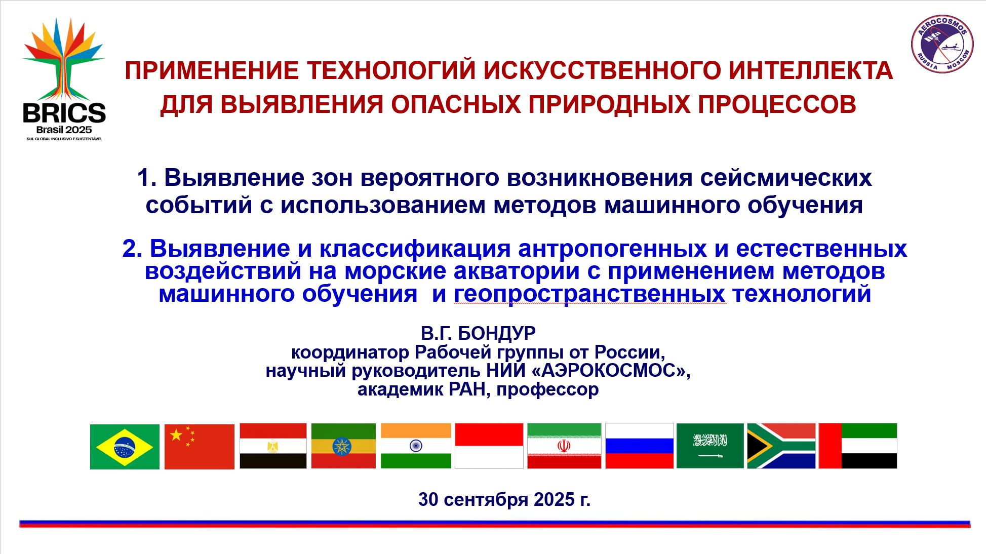 Координатор Рабочей группы от России, научный руководитель НИИ «АЭРОКОСМОС» академик РАН В.Г.Бондур выступил с докладом, содержащим отчет о 3-й встрече Рабочей группы БРИКС по геопространственным технологиям и их применению, которая состоялась в сентябре 2024 г. в России в год председательства Российской Федерации в БРИКС.