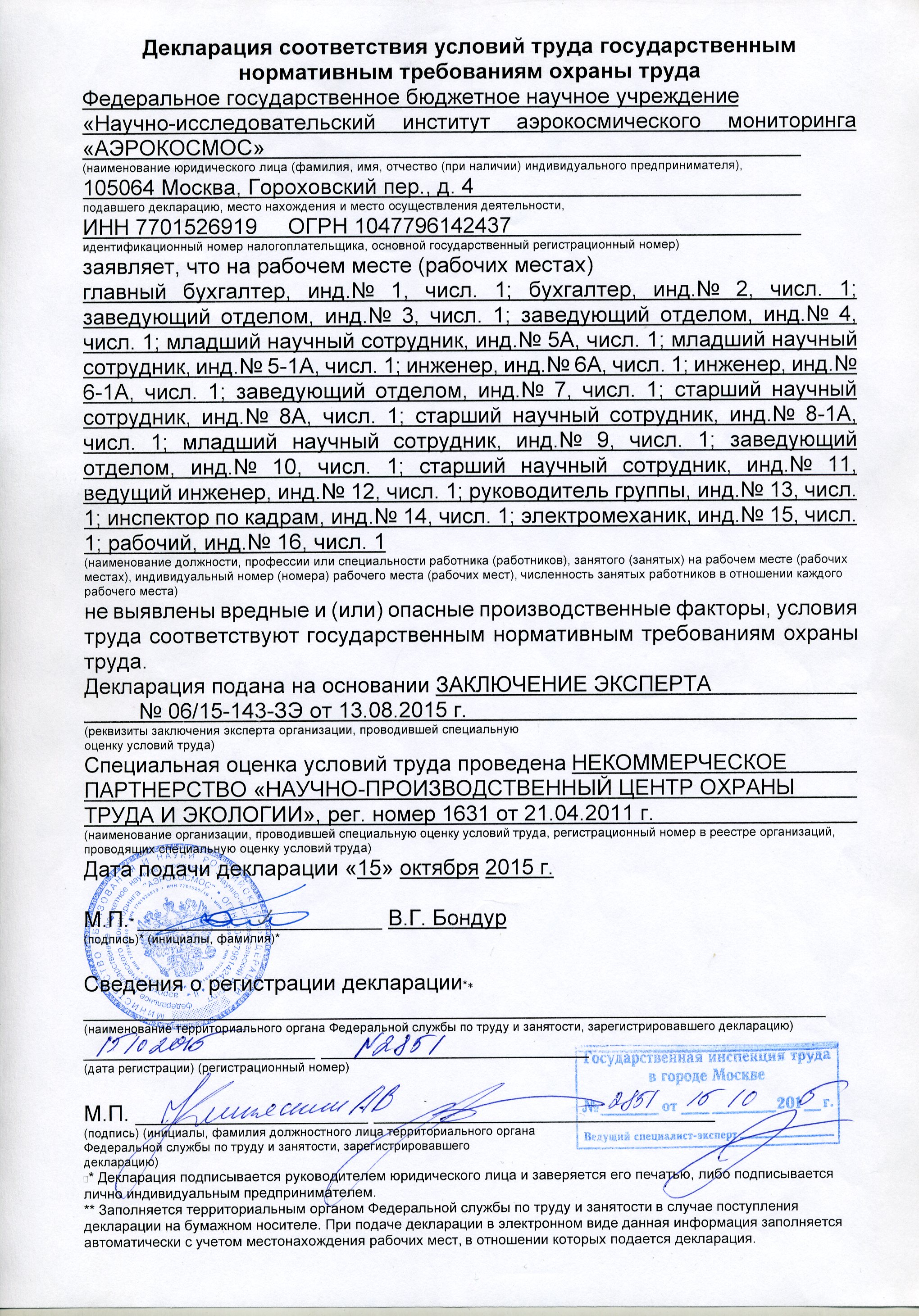 В период с 15 июня по 13 августа 2015 года в НИИ «АЭРОКОСМОС» совместно с НП «НПЦ ОХРАНЫ ТРУДА И ЭКОЛОГИИ» проводилась специальная оценка условий труда (СОУТ). По результатам проведения СОУТ составлен Отчет и подана Декларация соответствия условий труда государственным нормативным требованиям охраны труда в Государственную инспекцию труда в городе Москве за № 2851 от 15.10.2015 г.