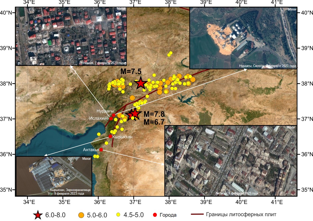 Рисунок 2 - Карта с эпицентрами землетрясений с 6 по 14 февраля 2023 года и космическими изображениями, полученными со спутника WORLDVIEW с их последствиями
