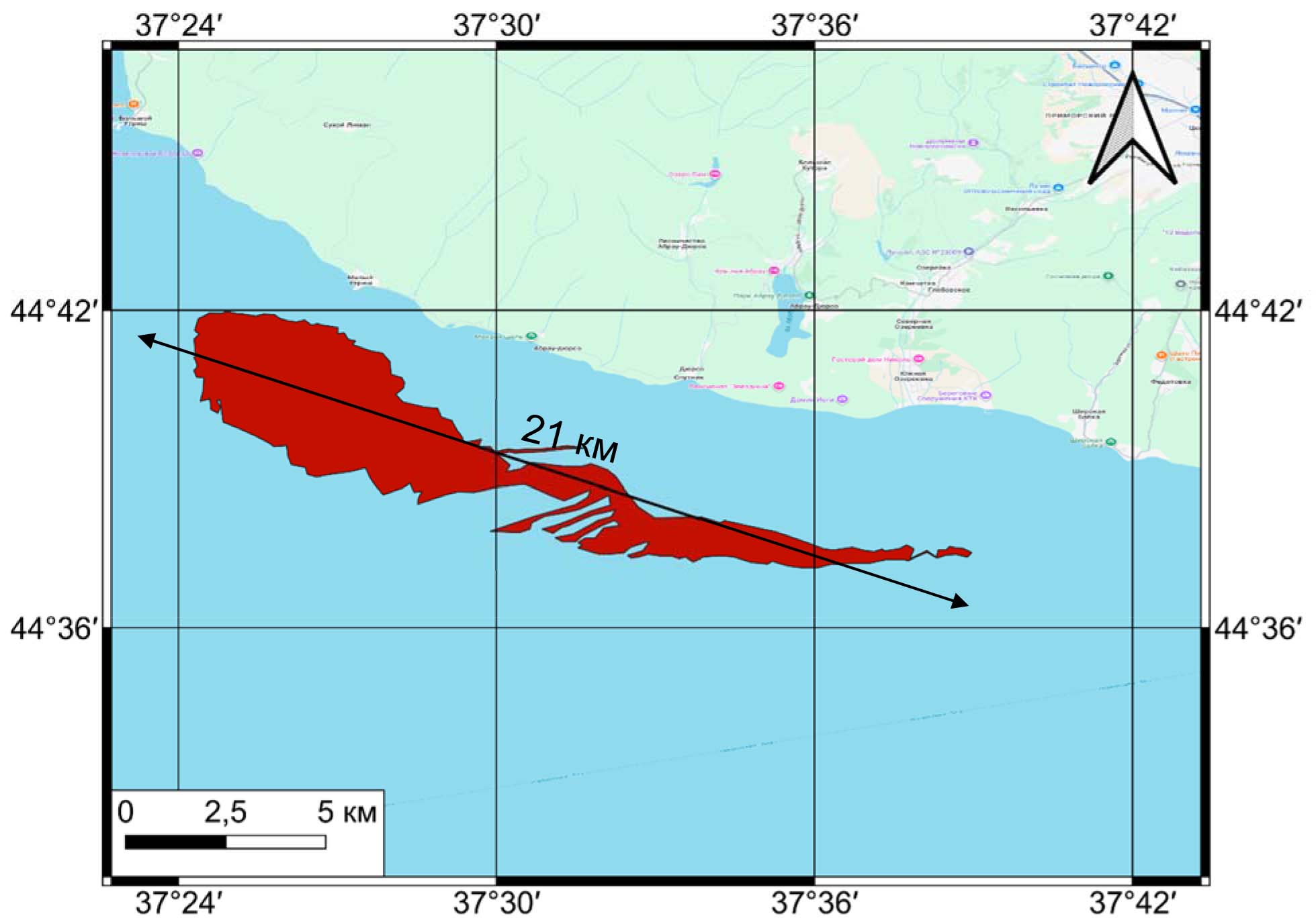 В НИИ «АЭРОКОСМОС» выполнены обработка и предварительный анализ спутниковых радиолокационных данных дистанционного зондирования Земли, полученных с космического аппарата Sentinel-1С в районе прибрежных акваторий у города Новороссийск. На информационном продукте, приведённом на рисунке 1, представлены результаты обнаружения вышеописанного аварийного разлива, который привёл к возникновению антропогенного пленочного загрязнения морской поверхности. На рисунке 2 приведена сводная карта выявленного загрязнения.