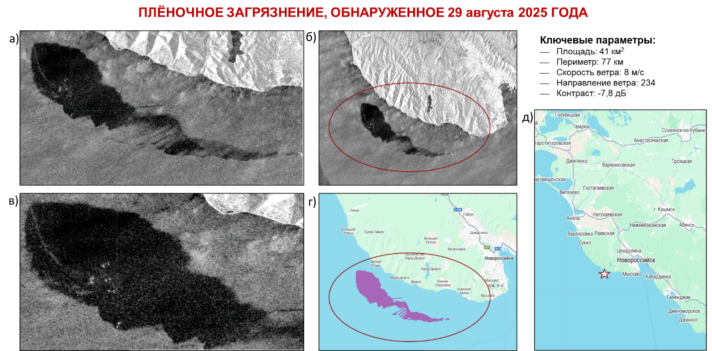 Рис. 1. Информационный продукт, сформированный по результатам обнаружения загрязнения вблизи г. Новороссийск 29.08.2025 в 15:18 UTC